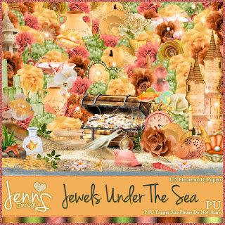 Introducing Jewels Under the Sea by Jenn's Designs. This gorgeous scrap kit comes with 125 elements and 10 papers for a lovely beach and sea themed tag. You can find this kit at the following stores: Pics for Design, Designer Scraps, Scraps N Company.